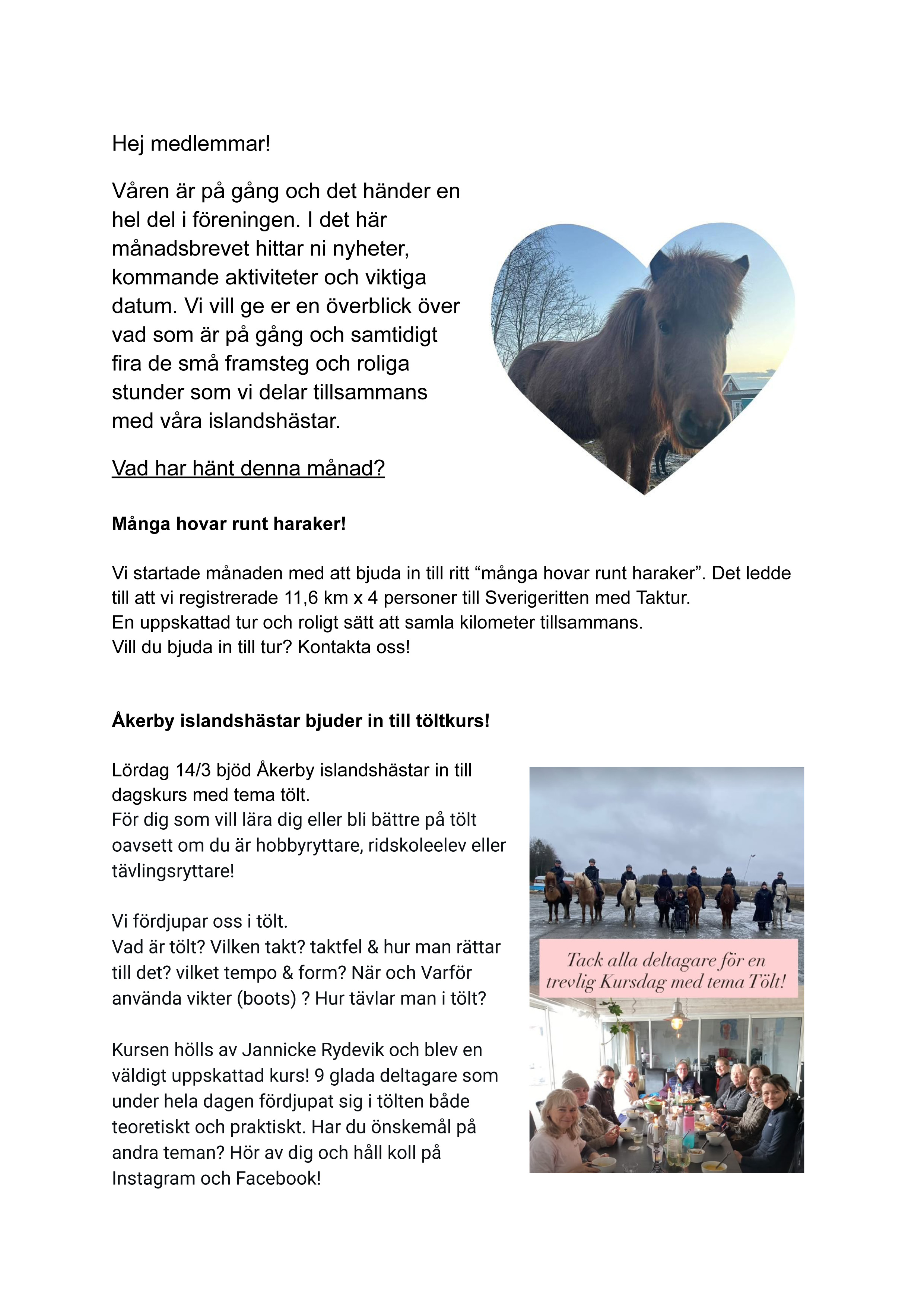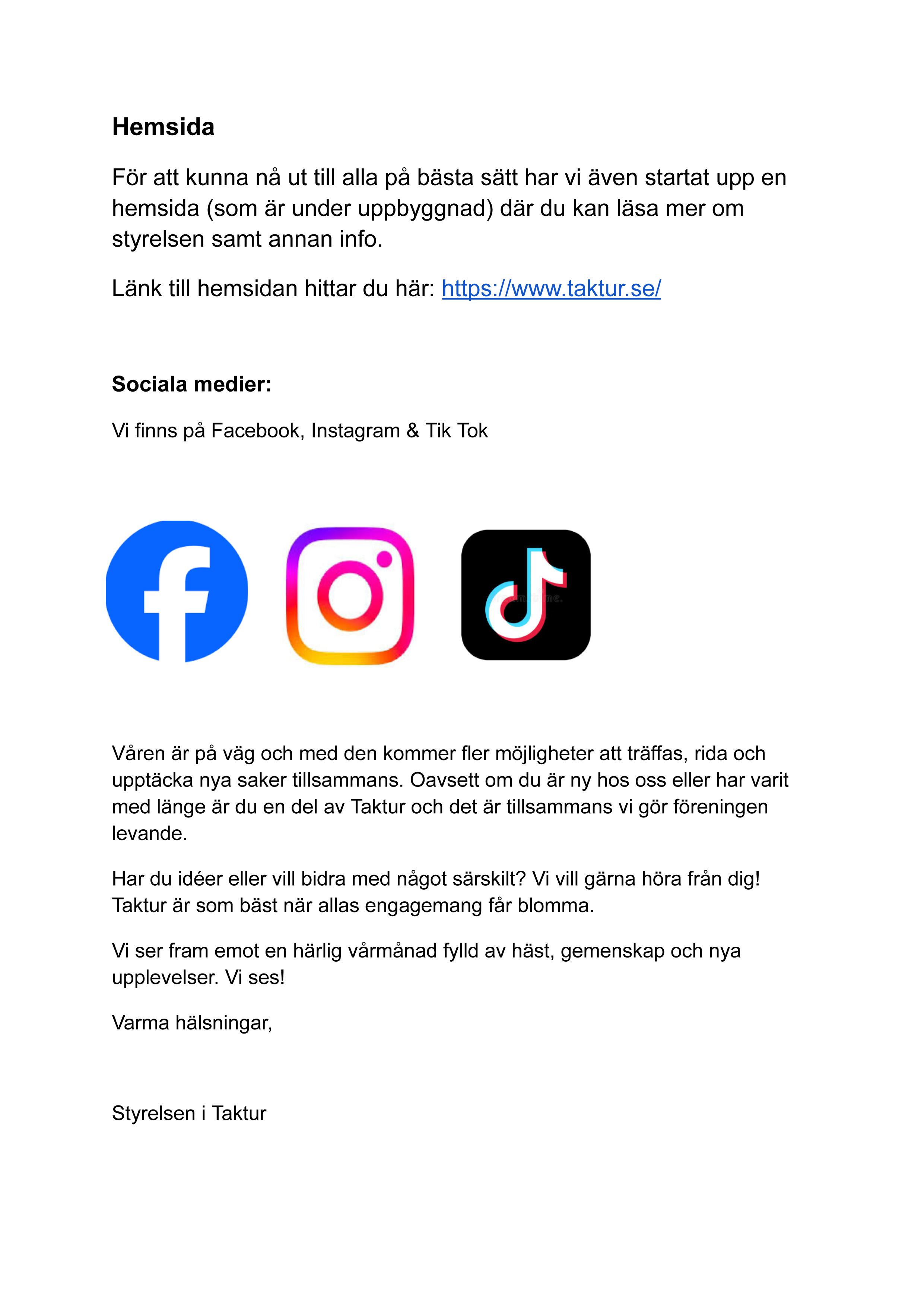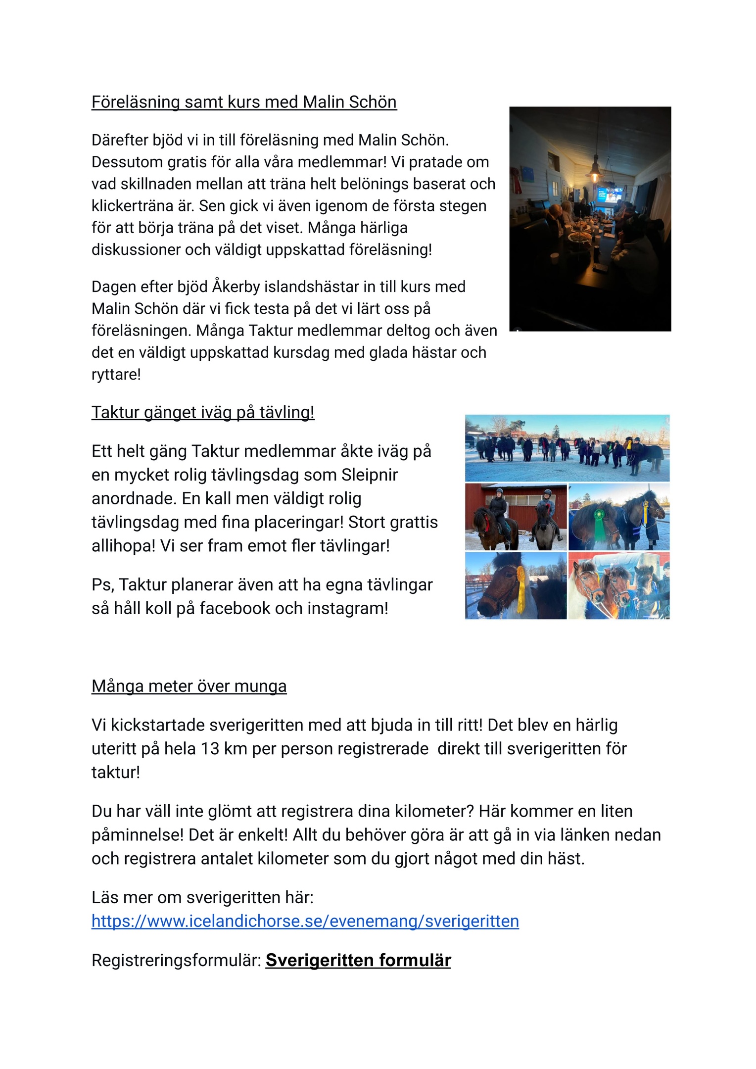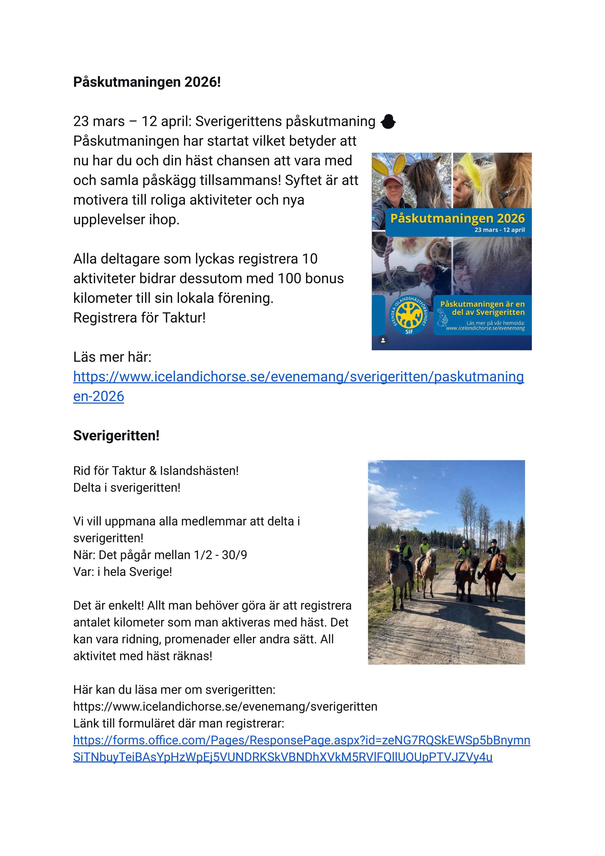 Välkommen till Taktur, en förening dedikerad till alla som älskar islandshästar! Vi samlar entusiaster på alla nivåer, från barn till vuxna, och erbjuder en inkluderande gemenskap för både nybörjare och erfarna ryttare. Beläget i Åkerby, Haraker, anordnar vi aktiviteter som stärker gemenskap och sprider glädje bland medlemmar. Hos oss är alla alltid välkomna, oavsett var du bor eller vilken erfarenhet du har!