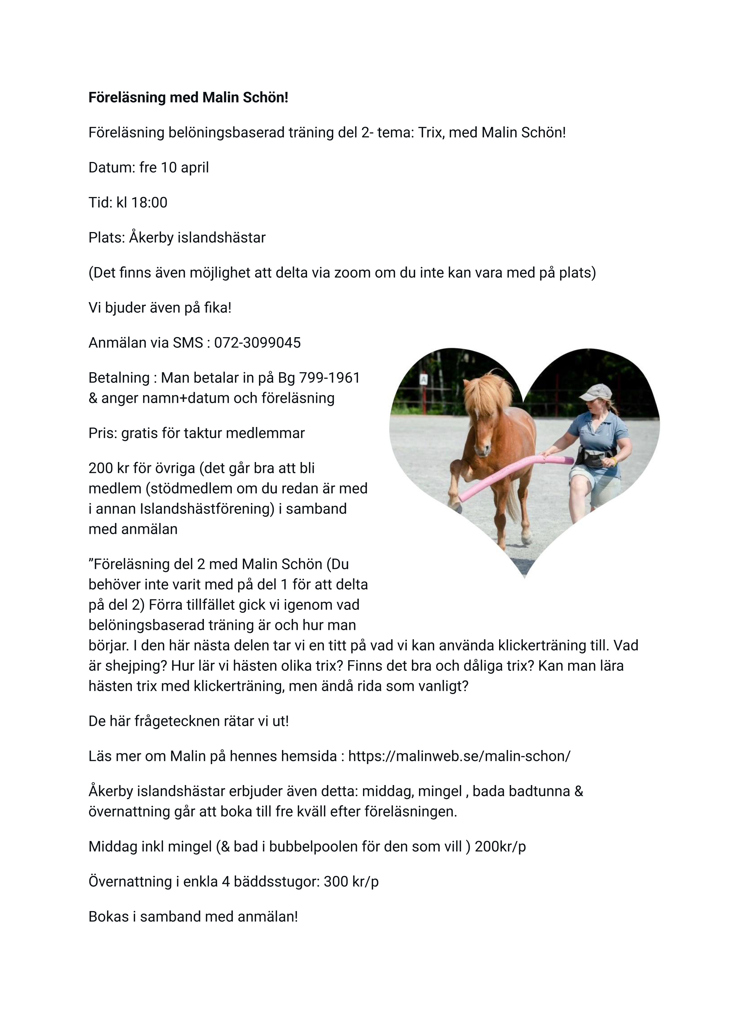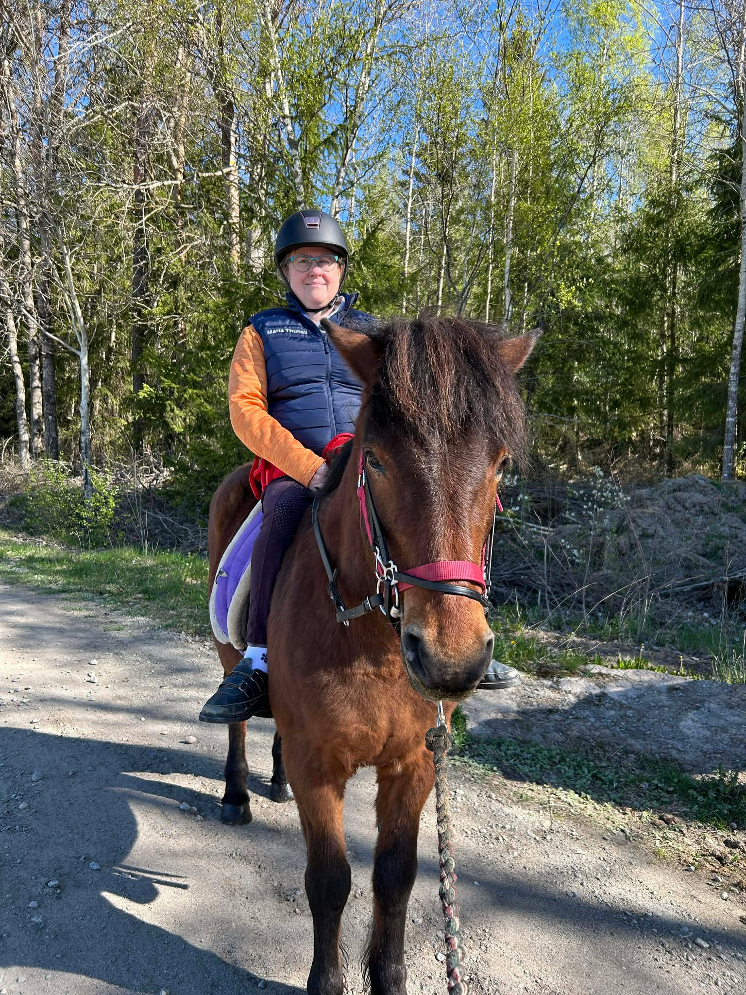 Maria heter jag. Rörelsehindrad sedan födseln. Började rida på handikapp ridningen på Rocklunda 1980 tror jag det var. Slutade när rädslan kom efter en avåkning i 10-12 års åldern och började igen som vuxen via ridterapin som habiliteringen hade. Sen dess är jag fast för ridningen igen. Jannicke och Åkerby Islandshästar kom jag i kontakt med när vi från handikapp ridningen på Rocklunda åkte ut och fick rida Islandshäst i naturen 1 gång/år. Sedan 2 år tillbaka har Jannicke bjudit ut mig till Åkerby för att bl a vara med på Mulle-tävlingen 2023 som jag tyvärr missade den gången då jag blev sjuk så red den 2024 istället. Sen har jag varit med på ett par tävlingar Jannicke haft. Några privata lektioner har det också blivit